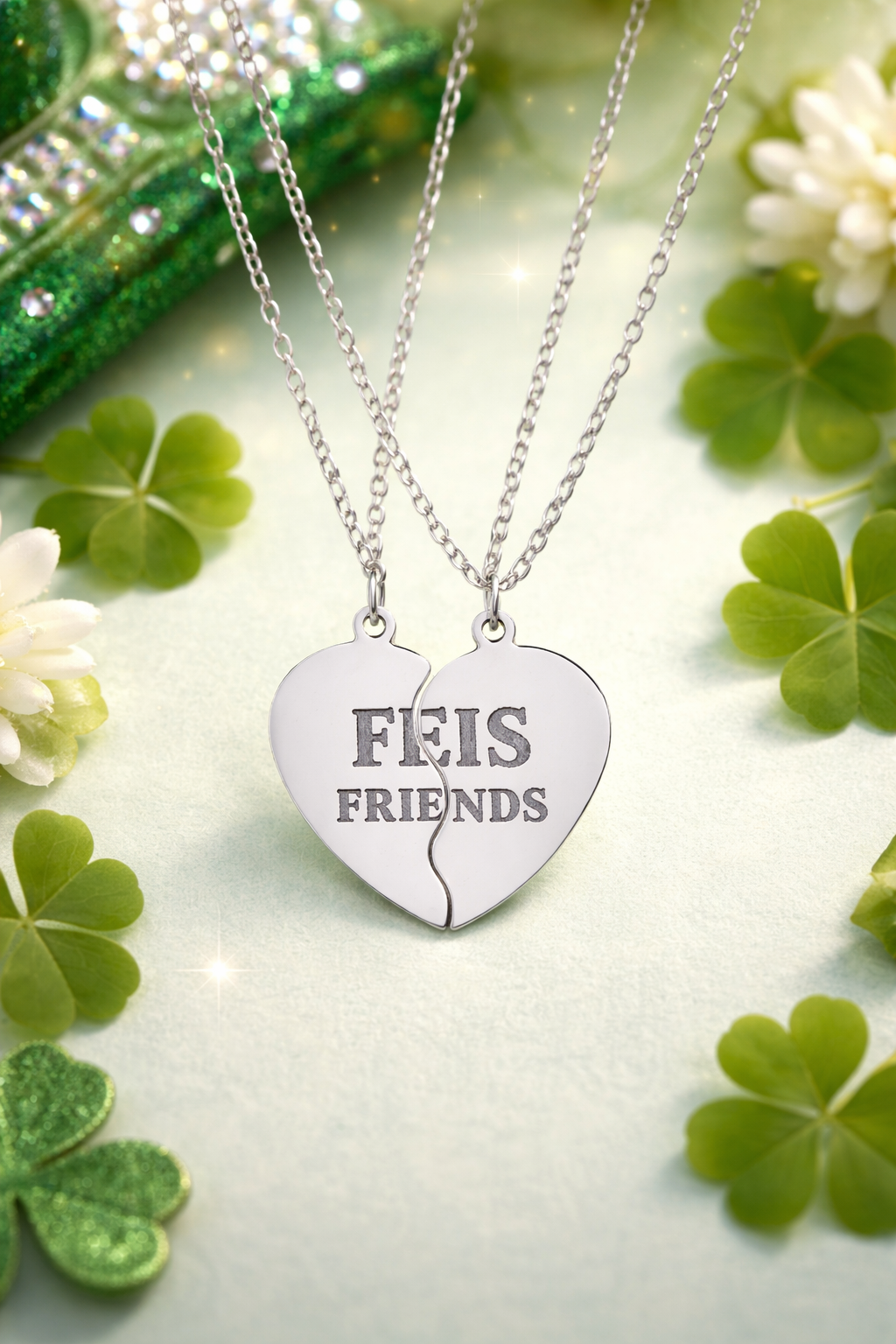 Two-piece break-apart heart necklace set made to celebrate close friendships. Each half of the polished heart pendant hangs on its own delicate chain, so two people can carry a matching keepsake. The split-heart design fits together seamlessly and is engraved with a playful “Feis Friends” motif that catches the light. Finished in durable 316L surgical-grade stainless steel with an optional PVD 18K gold coating, these necklaces resist tarnish, water, and everyday wear. Packaged in a white jewelry box with non-tarnish cotton fiber, the set arrives ready to gift and built to last through shared adventures and quiet moments alike.