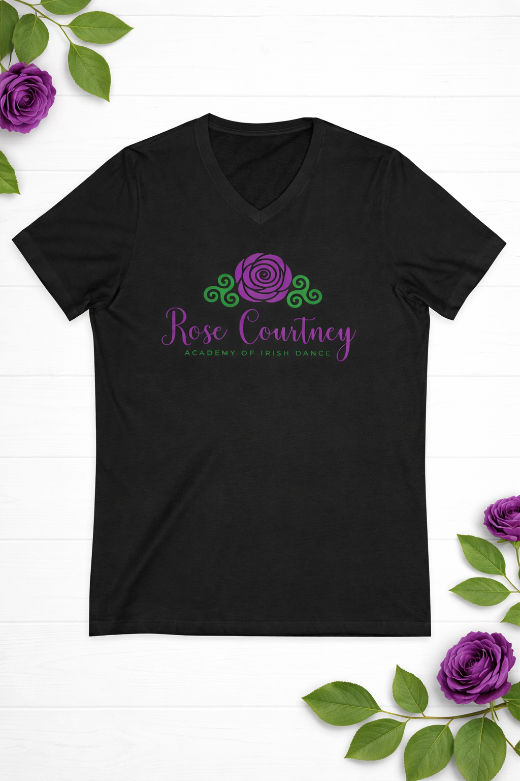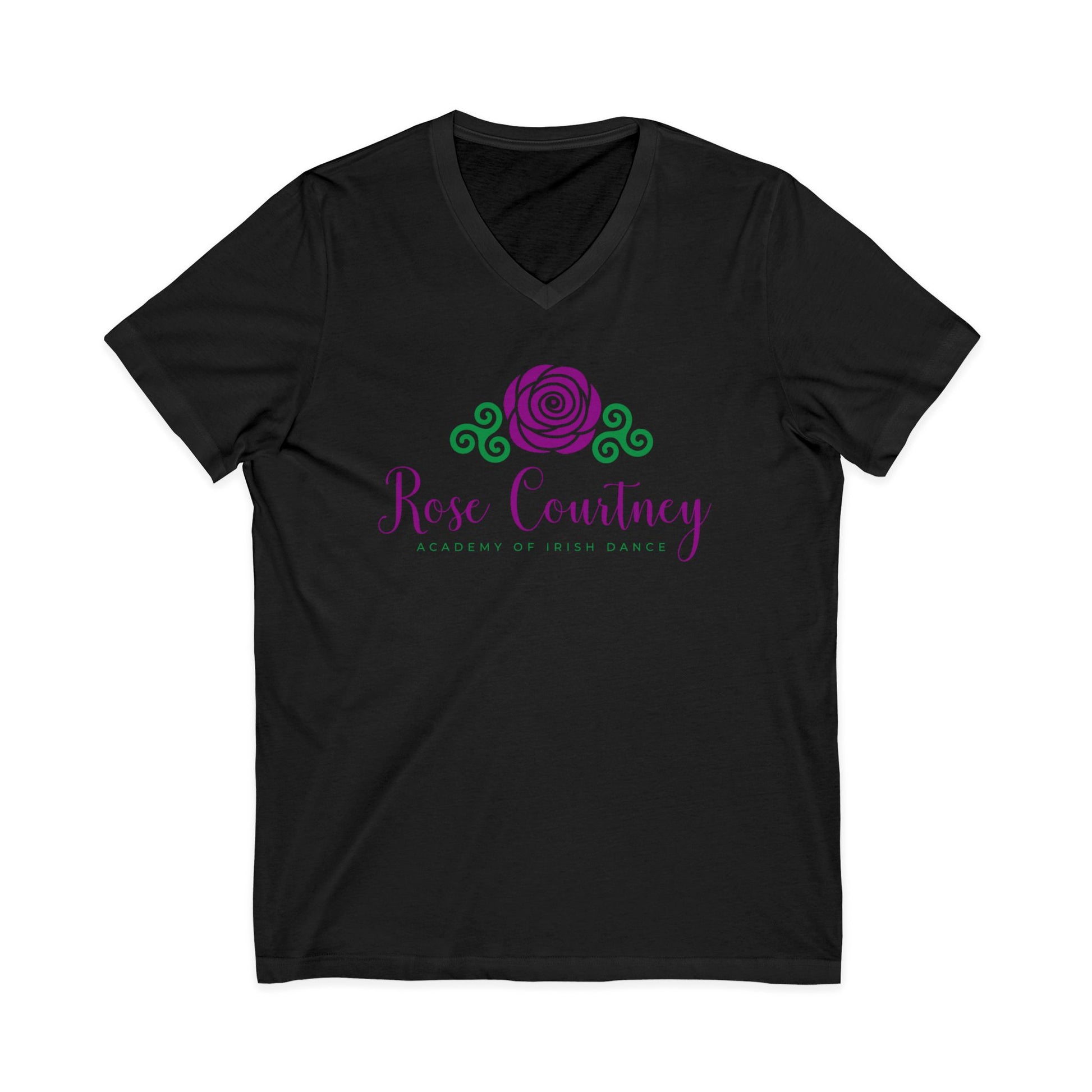 This soft, breathable V-neck tee features the Rose Courtney School of Irish Dance logo in a clean, confident design that feels timeless — just like the tradition you represent. Lightweight and easy to wear, it drapes comfortably over the shoulders and keeps you cool through long practice nights, spring feiseanna, or those “just one more run-through” moments.