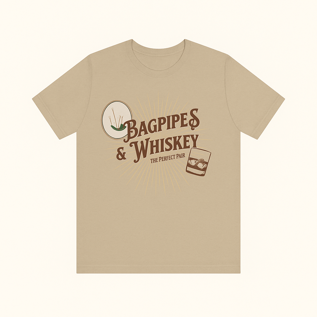 Celebrate the spirit of tradition and good taste with our "Bagpipes & Whiskey" tee — the perfect blend of Celtic pride and laid-back charm. Featuring a playful graphic with a set of bagpipes and a glass of whiskey, this shirt is a must-have for lovers of music, heritage, and a smooth pour.
